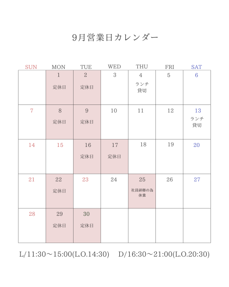 ※9月4日と13日のランチタイムは貸切営業となります。あらかじめご了承くださいませ。